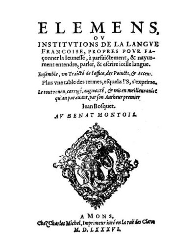 Bosquet Jean● Elemens ou institutions de la langue françoise. Ensemble, un traicte de l’office, des poincts, et accens● Mons : Charles Michel● 1586● ELEMENS, || OV || INSTITVTIONS DE LA LANGVE || FRANCOISE, PROPRES POVR FA- || çonner la Ieunesse, à parfaictement, & nayue- || ment entendre, parler, & escrire icelle langue. || Ensemble, un Traicté de l’office, des Poincts, & Accens. || Plus vne table des termes, esquelz l’S, s’exprime. || Le tout reueu, corrigé, augmenté, & mis en meilleur ordre || qu’au parauant, par son Autheur premier || Iean Bousquet. || AV GENAT MONTOIS. || [typographical device] || A MONS, || Chez Charles Michel, Imprimeur iuré en la ruë des Clercs, || M. D. LXXXVI. || USTC ● USTC : 78376 . Lindemann, 1994 : p.607, «Jean BOSQUET».