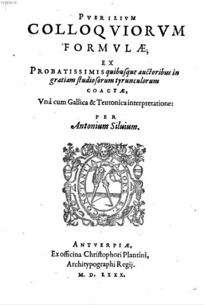 Silvius Antonius● Puerilium colloquiorum formulae, una cum Gallica & Teutonica interpretatione● Anvers : Christophe Plantin● 1580● PVERILIVM || COLLOQVIORVM || FORMVLAE ; || EX || PROBATISSIMIS quibusque auctoribus in || gratiam studiosorum tyrunculorum || COACTAE, || Vnà cum Gallica & Teutonica interpretatione : || PER || Antonium Siluium. || [Device] || ANTVERPIAE, || Ex officina Christophori Plantini, || Architypographi Regij. || M. D. LXXX. || USTC ● USTC : 78339 . Claes, 1974 : n°267 . Lindemann, 1994 : p.654-655, «Antonius SlLVlUS».