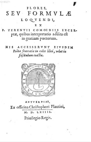 ● Anvers : Christophe Plantin● 1564● FLORES, || SEV FORMVLAE || LOQVENDI, || EX || P. TERENTII || COMOEDIIS EXCER- || ptae, quibus interpretatio addita est || in gratiam puerorum. || HIS ACCESSERVNT EIVSDEM || Poëtae sententiae in calce libri, velut in || fasciculum coactae. || [device] || ANTVERPIAE, || Ex officina Christophori Plantini, || [-] || M. D. LXIIII. || Priuilegio Regis. USTC ● USTC : 79523 . 2 langues : Français ♢ Latin ♢