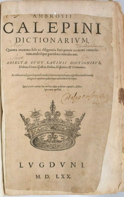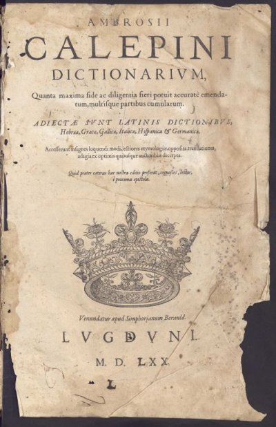 Calepino Ambrogio● Dictionarium [...] adjectae sunt Latinis dictionibus Hebraeae, Graecae, Gallicae, Italicae, Hispanicae et Germanicae● Lyon : [Symphorien Béraud]● 1570● ambrosii ||calepini ||dictionarivm , || Quanta maxima fide ac diligentia fieri potuit accuratè emenda- || tum, multisque partibus cumulatum. || ADIECTAE SVNT LATINIS DICTIONIBVS, || Hebraeae, Graecae, Gallicae, ltalicae, Hispanicae & Germanicae. || Accesserunt insignes loquendi modi, lectiores etymologiae, opposita, translationes, || adagia ex optimis quibusque auctoribus decerpta. || Quid praeter caeteras haec nostra editio proferat, cognosces, lector, || è proxima epistola. || [Marque] ||lvgdvni . ||m.d.lxx . ||Labarre75 ● Beaulieux, 1904 : p.377 , «Calepinus (Ambrosius) ». Labarre, 1975 : n°117.