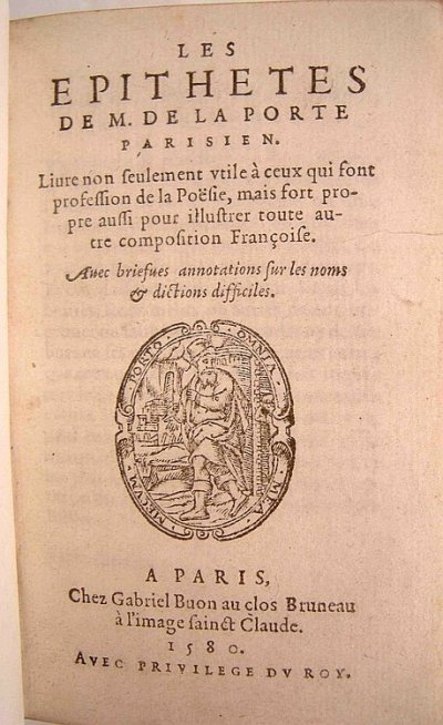 La Porte Maurice (de)● Les epithetes● Paris : Gabriel Buon● 1580● LES || EPITHETES || DE M. DE LA PORTE || PARISIEN. || Liure non seulement vtile à ceux qui font || profession de la Poësie, mais fort pro- || pre aussi pour illustrer toute autre || composition Françoise. || Auec briefues annotations sur les noms || & dictions difficiles. || [Device] || A PARIS, || Chez Gabriel Buon au clos Bruneau || à l’image Sainct Claude. || 1580. || AVEC PRIVILEGE DV ROY. USTC ● USTC : 45660 , 38167 . Beaulieux, 1904 : p.391 , «La Porte (Maurice de). ». Lindemann, 1994 : p.587, «[Maurice] de LA PORTE».
