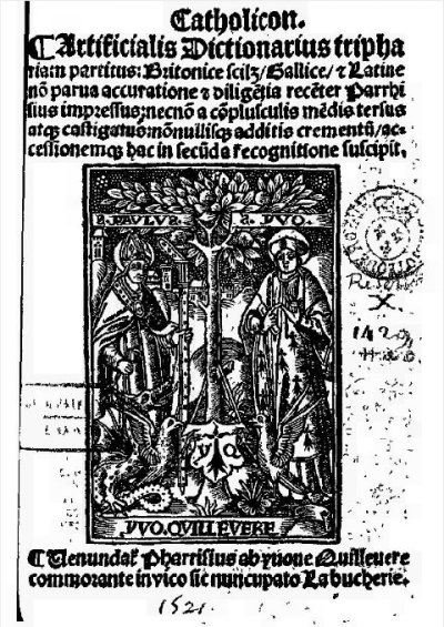 Lagadeuc Jean]● Catholicon. Artificialis dictionarius tripharium partitus, Britonice scilicet, Gallice et Latine tersus atque castigatus nonnullisque additis crementum hac in secunda recognitione suscipitUSTC ♢ Catholicon artificialis dictionariam triphariam partibus : Britonnice scillicet Gallice et LatineUSTC● (Paris) : (Yves Quilleveré)● (1521)● Catholicon. || ¶ Artificialis Dictionarius tripha || riam partitus : Britonice scilz/ Gallice/ & Latine || nõ parua accuratione & diligẽtia recẽter Parrhi || sius impressus : necnõ a cõplusculis mẽdis tersus || atqz castigatus : nõnillisqz additis crementũ/ ac= || cessionemqz hac in secũda recognitione suscipit. || [Device] || ¶ Venundat Pharrisius ab yuoue Quilleuere || commorante in vico sic nuncupato La bucherie. USTC ● BP16 : BP16_104311 . CCfr via BnF. USTC : 184163 , 78035 . Beaulieux, 1904 : p.374 . Lindemann, 1994 : p.586, «Jean LAGADEUC».