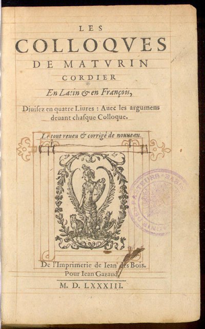 Cordier Mathurin● Les colloques● Genève : Jean Desboys pour Jean Gazeau● 1583● LES || COLLOQVES || DE MAHVRIN CORDIER || En Latin & en François, || Diuisez en quatre Liures : Auec les argumens || deuant chasque Colloque. || Le tout reueu & corrigé de nouueau. || [device : classical soldier] || De l’Imprimerie de Iean des Bois. || Pour Iean Gazaud. || [-] || M. D. LXXXIII. USTC ● USTC : 75078 . 2 langues : Français ♢ Latin ♢