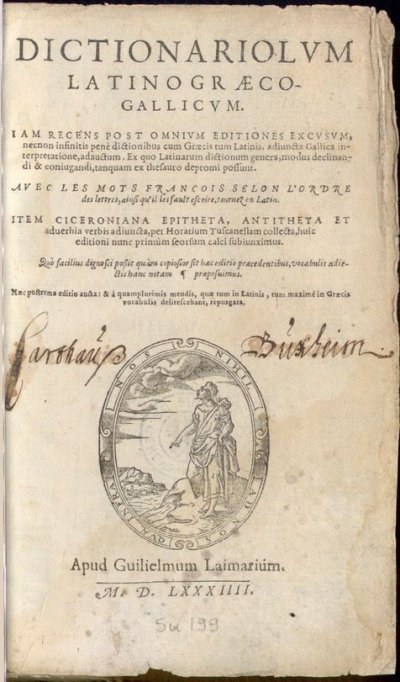 Estienne Robert]● Dictionarium Latinogallicum● [Genève]Lind94 ou [Lyon]Lind94/USTC ou [Paris]BnF : (François Estienne), Sébastien Honorat● 1570● DICTIONARIVM || Latinogallicum. || EX HOC, LATINI SERMONIS CVM GALLICO || idiomate consensum ita percipies, vt maiores vtriusque linguae scriptores || proximè imitari possis. Magnum bonarum literarum studiosis || adiumentum, qui vel dicendo, vel etiam scribendo, eorum || quae iam exciderunt, quaeque hoc tempore proba- || ta sunt, vocabulorum memoriam refi- || cere desiderant. || Accesserunt, praeter alia, Graecae dictiones suis quaeque Latinis, quàm || commodè fieri potuit, respondentes, in usum utriusque || linguae studiosorum. || Editio postrema, quae quantum superioribus praestet, proximè sequens || lectorem docebit Epistola. || [Device] || Apud Sebastianum Honoratum. || M. D. LXX. USTC ● USTC : 57383 . Beaulieux, 1904 : p.385-386 , «Estienne (Robert). ». Lindemann, 1994 : p.573, «[Robert ESTIENNE]».