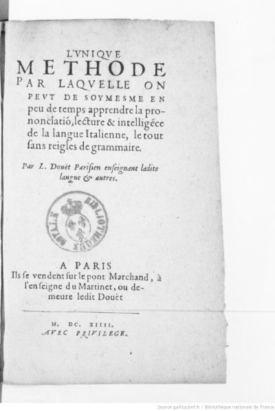 ▨Canal Pierre● Dictionaire françois et italien● Paris : Thomas de La Ruelle● 1603● DICTIONAIRE || FRANCOIS ET || ITALIEN : || SECONDE EDITION, || Corrigee & augmentee de plus du tiers, tant de mots || que de phrases de l’vne & de l’autre langue, depuis || la precedente & derniere edition, en faueur || de tous ceux qui sont studieux de ces deux || nobles langues. || PAR M. PIERRE CANAL. || [Marque] || A PARIS, || Chez THOMAS DE LA RVELLE, tenant sa boutique || au Palais, sur le perron de la saincte || Chapelle. || [Filet] || M,DCIII. Bingen87 ● USTC : 6000436 . Bingen, 1987 : p.97 et 101-102, n°4e.