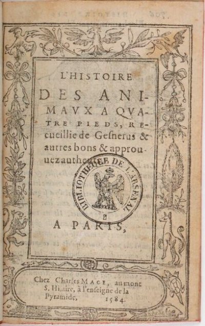 Linocier Geoffroy  L’histoire des animaux à quatre pieds Paris : Charles Macé  1584