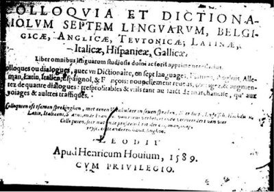 Berlaimont Noël (de)]Niede95/USTC● Colloquia et dictionariolum septem linguarum, Belgicae, Anglicae, Teutonicae, Latinae, Italicae, Hispanicae, Gallicae. Colloques ou dialogues. Colloquien oft tsamen sprekingen● Liège : Henricus Hovius● (1589) et 1591● COLLOQVIA ET DICTIONA- || RIOLVM SEPTEM LINGVARVM, BEL- || GICAE, ANGLICAE, TEVTONICAE ; LATINAE, || Italicae, Hispanicae, Gallicae. || Liber omnibus linguarum studiosis domi ac foris apprime necessarius. || Colloques ou dialogues, auec vn Dictionaire, en sept languages, Flamen, Anglois, Alle- || man, Latin, Italien, Espaignol, & François : nouuellement reueus, corrigez, & augmen- || tez de quattre [sic] dialogues : tresprofitables & vtils tant au faict de marchandise, qu’aux || voiages & aultres traffiques. || Colloquien oft tsamen sprekinghen, met eenen Vocabulaer in seuen spraken, Neerduits, Engelsch, Hochduits, || Latin, Italiaens, Spaens, endo Fransois : van nieus verbetert ende vermeerdert van vior || Colloquien, seer nut ende profitelick tot der coopmanschap. || reyse, ende anderen handelinghen. || LEODII || Apud Henricum Houium, 1591. || CVM PRIVILEGIO. || USTC ● USTC : 76369 , 340763 . Musée Virtuel des Dictionnaires (MVD).