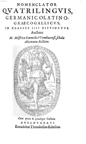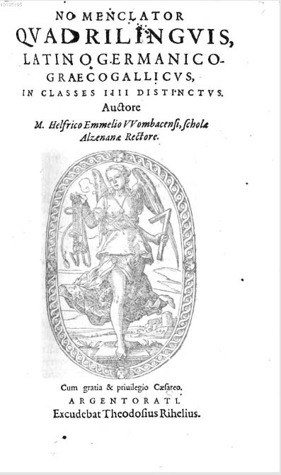 Emmel Helfrich● Nomenclator quadrilinguis, Latino germanico graeco gallicus● Strasbourg : Theodosius Rihel● 1592● NOMENCLATOR || QVADRILINGVIS, || LATINO GERMANICO- || GRAECOGALLICVS, || IN CLASSES IIII DISTINCTVS. || Auctore || M. Helfrico Emmelio VVombacensi, scholae || Alzenanae Rectore. || [Device] || Cum gratia & priuilegio Caesareo. || ARGENTORATI. || Excudebat Theodosius Rihelius. || USTC ● USTC : 678258 , 678257 , 78413 . Lindemann, 1994 : p.563, «Helfricus EMMELIUS».
