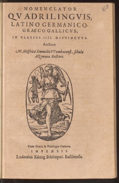 Emmel Helfrich● Nomenclator quadrilinguis germanico latino graeco gallicus● Bâle : Ludovico König● [1592]● État BLind94● NOMENCLATOR || QVADRILINGVIS, || GERMANICO LATINO- || GRAECOGALLICVS, || IN CLASSES IIII. DISTINCTVS. || Auctore || M. Helfrico Emmelio VVombacensi, scholae || Alzenanae Rectore. || [Device] || Cum Gratia & Priuielgio Caesareo. || IMPENSIS || Ludouico König Bibliopol. Basiliensis. USTC ● USTC : 78412 . Lindemann, 1994 : p.563, «Helfricus EMMELIUS».