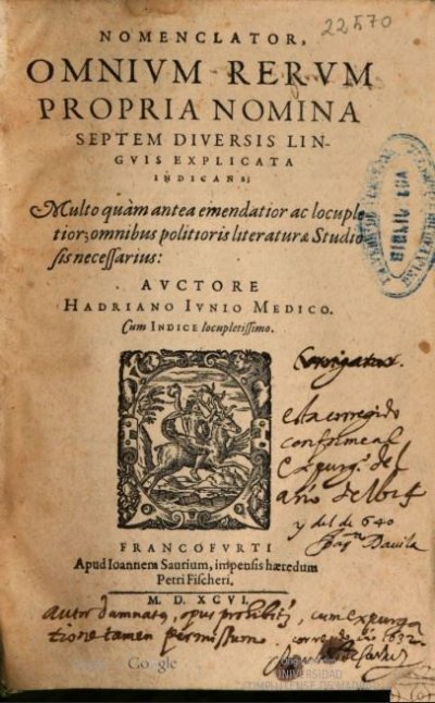 Junius Hadrianus● Nomenclator, omnium rerum propria nomina septem diversis linguis explicata indicans● Francfort-sur-le-Main : Peter Fischer, Johannes Saur aus Wetter● 1596● NOMENCLATOR, || OMNIVM RERVM || PROPRIA NOMINA || SEPTEM DIVERSIS LIN- || GVIS EXPLICATA || INDICANS ; || Multo quàm antea emendatior ac locuple- || tior ; omnibus politioris literaturae Studio- || sis necessarius : || AVCTORE || HADRIANO IVNIO MEDICO. || Cum INDICE locupletissimo. || [device] || FRANCOFVRTI || Apud Ioannem Saurium, impensis haeredum || Petri Fischeri. || [-] || M. D. XCVI. USTC ● USTC : 83858 , 78444 , 441569 , 441570 , 678264 . Beaulieux, 1904 : p.390 , «Junius (Hadrianus). ». Claes, 1974 : n°333 et 334 . Lindemann, 1994 : p.584, «Hadrianus JUNIUS». Niederehe, 1995 : n°809.