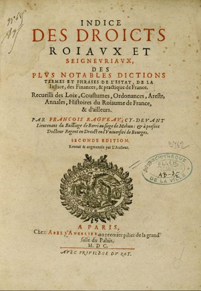 Ragueau François● Indice des droicts roiaux et seigneuriaux, des plus notables dictions, termes et phrases de l’estat● Paris : Abel L’Angelier● 1600● INDICE || DES DROICTS || ROIAVX ET || SEIGNEVRIAVX, || DES || PLVS NOTABLES DICTIONS || TERMES ET PHRASES DE L’ESTAT, DE LA || Iustice, des Finances, & practique de France. || Recueilli des Loix, Coustumes, Ordonances, Arests[sic], || Annales, Histoires du Roiaume de France, || & d’ailleurs. || PAR FRANCOIS RAGVEAV, CY-DEVANT || Lieutenant du Bailliage de Berri au siege de Mehun : & à present || Docteur Regent en Droict en l’Vniversité de Bourges. || SECONDE EDITION. || Reueuë & augmentée par l’Aucteur. || [device : Renouard 552] || A PARIS, || Chez ABEL L’ANGELIER, au premier pillier de la grand’ || salle du Palais. || M. DC. || [-] || AVEC PRIVILEGE DV ROY. USTC ● USTC : 48701 . Lindemann, 1994 : p.595, «Frangois RAGUEAU».