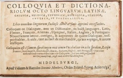 Berlaimont Noël (de)]● Colloquia et dictionariolum octo linguarum● Middelbourg : Symon Moulert● 1631● USTC : 5003529 , 3015510 . 8 langues : Allemand ♢ Anglais ♢ Espagnol ♢ Français ♢ Italien ♢ Latin ♢ Néerlandais ♢ Portugais ♢
