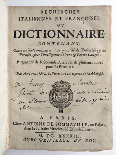 Oudin Antoine● Recherches italiennes et françoises, ou Dictionnaire contenant, outre les mots ordinaires, une quantité de proverbes● Paris : Antoine de Sommaville● 1640● USTC : 6039528 . Musée Virtuel des Dictionnaires (MVD).
