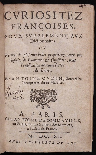 Oudin Antoine● Curiositez françoises pour supplément aux dictionnaires, ou Recueil de plusieurs belles propriétez, avec une infinité de proverbes et quolibets pour l’explication de toutes sortes de livres● Paris : Antoine de Sommaville● 1640● USTC : 6030914 . Musée Virtuel des Dictionnaires (MVD).