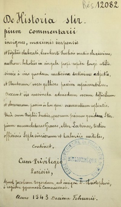 Fuchs Leonhart● De historia stirpium commentarii insignes● Paris : Jacques Bogard● 1543● Diplomatic Title : De Histoira stir || PIVM COMMENTARII || INSIGNES, MAXIMIS IMPENSIS || & Vigiliis elaborati, Leonharti Fuchsio medico cla= || rissimo, authore. Scholiis in singula propè capita lon= || gè utilissimis à uiro quodam medicinae doctissi= || mo adiectis, & Plãtarum uoces gallicas || passim exprimentibus. || Accessit iis succincta admodum vocum difficilium & || obscurarum passim in hoc opere occurrentiũ explicatio. || Vnà cum triplici Indice, quorum primus quidem Stir || pium nomenclaturas Graecas, alter Latinas, tertius || officinis Seplasiariorum & herbariis || usitatis, continet. || [Device] || CVM PRIVILEGIO || PARISIIS, || Apud Iacobum Bogardum, sub insigni D. Christopho || ri, è regione gymnasij Cameracensis. || Anno 1543 Decima Februarii. USTC ● BP16 : 111229 . USTC : 83340 . 2 langues : Français ♢ Latin ♢