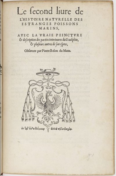 Belon Pierre● L’histoire naturelle des estranges poissons marins● Paris : Regnault Chaudière● 1551● L’histoire naturelle des || ESTRANGES POISSONS || MARINS, || AVEC LA VRAIE PEINCTVRE || & description du Daulphin, & de || plusieurs autres de son espece, || Obseruee par Pierre Belon du Mans. || [Vignette] || AVEC PRIVILEGE. || A PARIS. || De l’imprimerie de Regnaud Chaudiere. || 1551. ● USTC : 46715 , 11204 . 1 langue : Français ♢