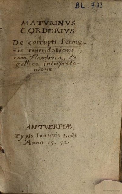 Cordier Mathurin]● [De corrupti sermonis emendatione, cum Flandrica, & gallica interpretanione]● (Anvers) : (Jan van der Loe)● (1552)● MATVRINVS || CORDERIVS || De corrupti sermo- || nis emendatione, || cum Flandrica, & gallica interpreta- || nione. || ANTVERPIÆ, || Typis Ioannis Loëi || Anno 15.52 ● USTC : 408746 . 3 langues : Français ♢ Latin ♢ Néerlandais ♢