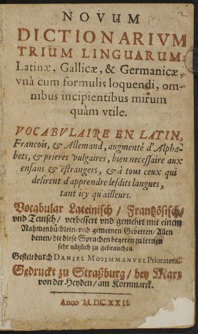 Mosimmanuel Daniel● Novum Dictionarium Trium Linguarum : Latinae, Gallicae, [et] Germanicae : una cum formulis loquendi, omnibus incipientibus mirum quam utile. Vocabulaire En Latin, François, [et] Allemand. Vocabular Lateinisch, Frantzösisch, und Teutsch● Strasbourg : Marx von der Heyden● 1622● USTC : 2084246 . 3 langues : Allemand ♢ Français ♢ Latin ♢