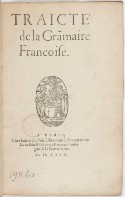 Estienne Robert]● Traicté de la grammaire francoise● Paris : Robert Estienne● 1569● TRAICTE’ || de la Grãmaire || Francoise. || [Device] || A PARIS, || Par Rob. Estienne Imprimeur du Roy. || M. D. LXIX. || USTC ● USTC : 39414 . Lindemann, 1994 : p.628, «[Robert ESTIENNE,]».