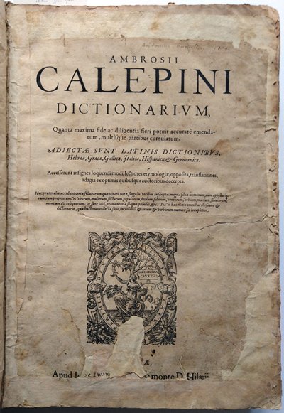 Calepino Ambrogio● Dictionarium, quanta maxima fide ac diligentia fieri potuit accurate emendatum, multisque partibus cumulatum. Adjectae sunt Latinis dictionibus Hebraeae, Graecae, Gallicae, Italicae, Germanicae et Hispanicae● Lyon : Guillaume Rouillé● 1578● USTC : 141559 . Draudius, 1625 : p.1346, «Dictionaria variarum linguarum ». Labarre, 1975 : n°132. Lindemann, 1994 : p.550, «Ambrosius CALEPINUS».