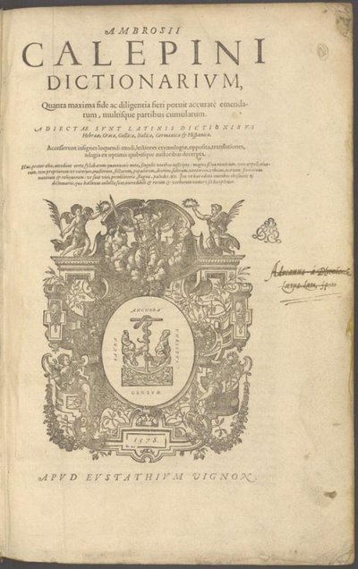 Calepino Ambrogio● Dictionarium, Quanta maxima fide ac diligentia fieri potuit accuratè emendatum, multisque partibus cumulatum. Adiectae sunt latinis dictionibus Hebreae, Graecae, Gallicae, Italicae, Germanicae & Hispanicae● Genève : Eustache Vignon● [1578]● AMBROSII || CALEPINI || DICTIONARIVM, || Quanta maxima fide ac diligentia fieri potuit accuratè emenda- || tum, multísque partibus cumulatum. || ADIECTAE SVNT LATINIS DICTIONIBVS || Hebraeae, Graecae, Gallicae, Italicae, Germanicae, & Hispanicae. || Accesserunt insignes loquendi modi, lectiores etymologiae, opposita, translationes, || adagia ex optimis quibusque auctoribus decerpta. || Huc, praeter alia, accedunt certae syllabarum quantitatis notae, singulis vocibus inscriptae : magna silua nominum, tum appellatiuo- || rum, tum propriorum : vt virorum, mulierum, sectarum, populorum, deorum, siderum, ventorum, vrbium, marium, fluuiorum : || montium & reliquorum : vt sunt vici, promontoria, stagna, paludes, &c. Ita vt haec editio omnibus thesauris & || dictionariis, quae hactenus collecta sunt, incredibili & rerum & verborum numero sit locupletior. || [Device : anchor device containing place of publication « GENEVAE » within cartouche containing date of publication « 1578. »] || APVD EVSTATHIVM VIGNON. USTC ● USTC : 49743 . Labarre, 1975 : n°131. Bingen, 1987 : p.43 et 46, n°17. Lindemann, 1994 : p.550, «Ambrosius CALEPINUS». Niederehe, 1995 : n°589.