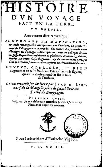 Léry Jean (de)● Histoire d’un voyage fait en la terre du Bresil● [Genève] : Héritiers d’Eustace Vignon● 1594● HISTOIRE || D’VN VOYAGE || FAIT EN LA TERRE || DV BRESIL, || Autrement dite Amerique. || CONTENANT LA NAVIGATION, || & choses remarquables veues sur mer par l’autheur. Le comporte- || ment de Villegagnon en ce pays-là. Les moeurs & façons de viure || estranges des Sauuages Ameriquains : auec vn Colloque de leur || langage. Ensemble la description de plusieurs Animaux, Arbres, || Herbes, & autres choses singulieres ,& du tout inconues [sic] pardeça : || dont on verra les sommaires des chapitres au cõmencemant du liure. || REVEVE, CORRIGEE, ET BIEN || augmentee en ceste troisieme Edition, tant de figures, || qu’autres choses notables sur le suiet || de l’autheur. || Le tout recueilli sur les lieux par IEAN DE LERY, || natif de la Margelle, terre de sainct Sene, au || Duché de Bourgongne. || PSEAVME CVIII. || Seigneur, ie te celebreray entre les peuples,& te diray || Pseaumes entre les nations. || [Device] || Pour les heritiers d’Eustache Vignon. || [-] || M. D. XCIIII. USTC ● USTC : 7000 . 2 langues : Français ♢ Langues amérindiennes ♢