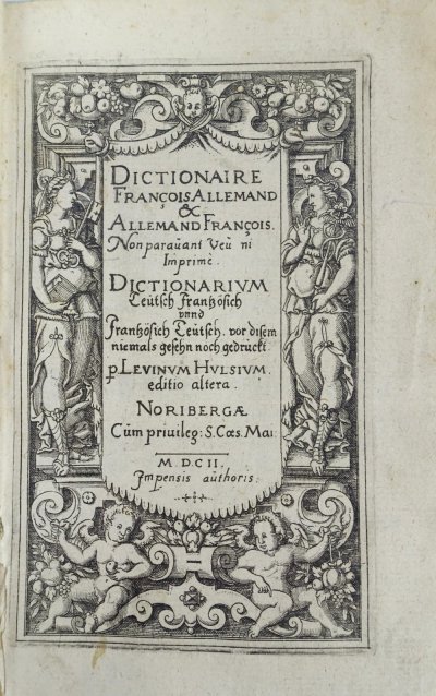 Hulsius Levinus● Dictionaire François Allemand &c Allemand François = Dictionarium Teutsch Frantzösich unnd Frantzösich Teutsch● Nuremberg : Levinus Hulsius● 1602● USTC : 2104501 . Beaulieux, 1904 : p.389 , «Hulsius (Levinus). ».