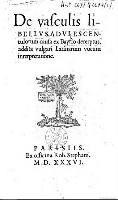 Baïf Lazare (de)● De vasculis libellus● Paris : Robert I Estienne● 1536● De vasculis li- || BELLVS, ADVLESCEN- || tulorum causa ex Bayfio decerptus, || addita vulgari Latinarum vocum || interpretatione. || [woodcut] || PARISIIS. || Ex officina Rob. Stephani. || M. D. XXXVI. USTC ● BP16 : BP16_108041 . USTC : 79704 . Beaulieux, 1904 : p.383 , «Estienne (Charles). ».
