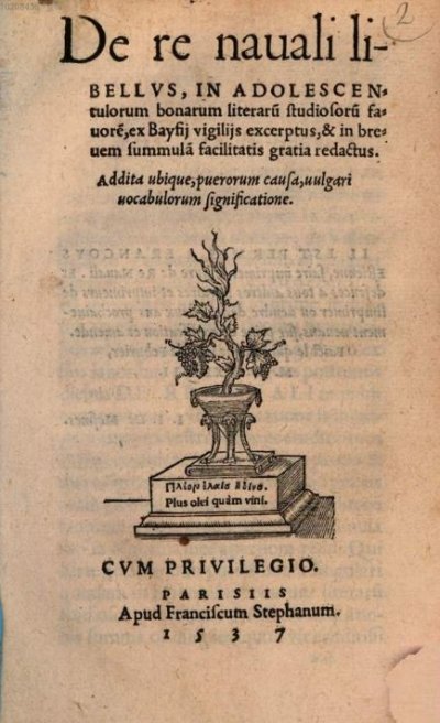 Baïf Lazare (de)● De re navali libellus● Paris : [Simon de Colines], François I Estienne● 1537● De re nauali li- || BELLVS, IN ADOLESCEN= || tulorum bonarum literarũ studiosorũ fa= || uorẽ, ex Bayfij vigilijs excerptus, & in bre= || uem summulã facilitatis gratia redactus. || Addita ubique, puerorum causa, uulgari || uocabulorum significatione. || [woodcut : vine] || CVM PRIVILEGIO. || PARISIIS || Apud Franciscum Stephanum. || 1537 USTC ● USTC : 88515 . 2 langues : Français ♢ Latin ♢