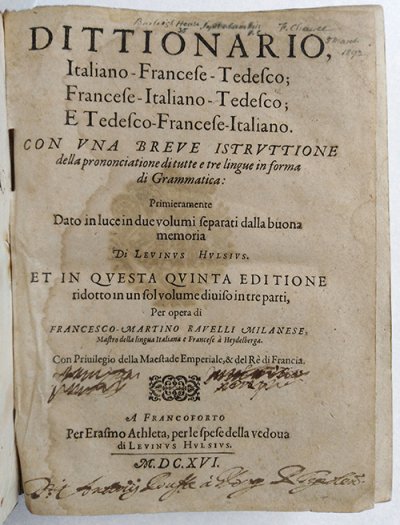 Hulsius Levinus● Dittionario italiano-francese-tedesco, francese-italiano-tedesco e tedesco-francese-italiano● Francfort-sur-le-Main : Erasmo Athleta● 1616● USTC : 5042290 , 2147480 . 3 langues : Allemand ♢ Français ♢ Italien ♢