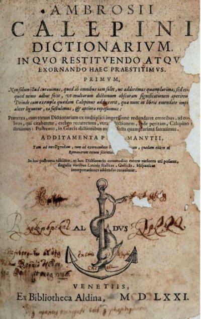 Calepino Ambrogio● Dictionarium, in quo restituendo atque exornando haec praestitimus [...] In hac postrema editione, ut hoc Dictionario commodius exterae nationes uti possent, singulis vocibus Latinis, Italicas, Gallicas, Hispanicas interpretationes addendas curavimus● Venise : « Bibliotheca Aldina » ou [Nicolas Bevilacqua]Lind94 ou [Paolo Manuzio]Lind94/USTC● 1571● AMBROSII || CALEPINI || DICTIONARIVM, || IN QVO RESTITVENDO ATQVE || EXORNANDO HAEC PRAESTITIMVS. || PRIMVM, || Non solum illud curauimus, quod ab omnibus iam solet, ut adderemus quamplurima ; sed etiam, || quod nemo adhuc fecit, vt multarum dictionum obscuram significationem aperiremus : || Deinde cum exempla quaedam Calepinus adduxerit, quae nunc in libris emendate impressis || aliter leguntur, ea sustulimus, & aptiora reposuimus : || Praeterea, cum totum Dictionarium ex multiplici impressione redundaret erroribus, ad eos li- || bros, qui citabantur, crebro recurrentes, veram lectionem, inde petitam, Calepino re- || stituimus : Postremo, in Graecis dictionibus male affecta quamplurima sanauimus. || ADDITAMENTA PAVLI MANVTII, || Tum ad intelligendam, tum ad exornandam linguam Latinam, quaedam etiam ad || Romanorum rerum scientiam utilissima. || In hac postrema editione, ut hoc Dictionarium commodius exterae nationes uti possent, || singulis vocibus Latinis Italicas, Gallicas, Hispanicas || interpretationes addendas curauimus. || [Device] || [-] || VENETIIS, || Ex Bibliotheca Aldina, MDLXXI. USTC ● USTC : 65775 . Labarre, 1975 : n°121. Bingen, 1987 : p.43 et 45, n°9. Lindemann, 1994 : p.548, «Ambrosius CALEPINUS». Niederehe, 1995 : n°532.