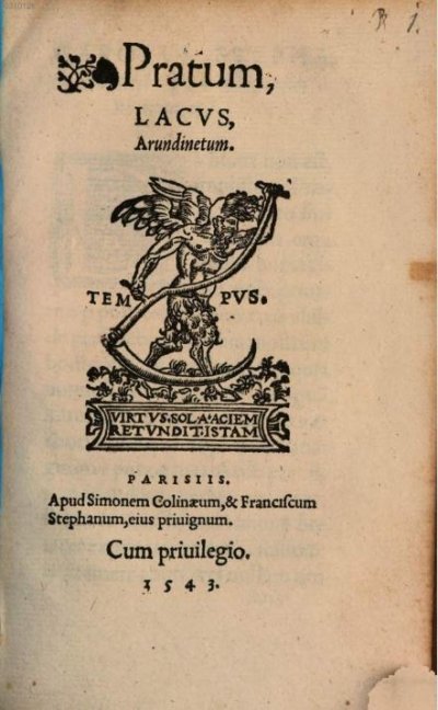Estienne Charles]● Pratum, lacus, arundinetum● Paris : Simon de Colines, François Estienne● 1543 [=1544]USTC● [fleuron] Pratum, || LACVS, || Arundinetum. || [Device : TEMPVS] || PARISIIS. || Apud Simonem Colinaeum, & Franciscum || Stephanum, eius priuignum. || Cum priuilegio. || 1543. USTC ● BP16 : BP16_111190 . USTC : 149066 , 88499 . Musée Virtuel des Dictionnaires (MVD).