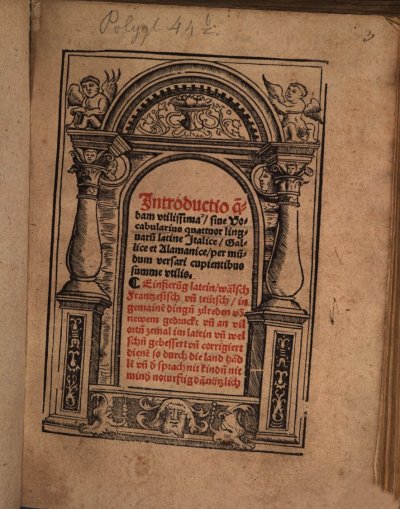 ● (Augsburg)USTC : Erhart Öglin● [1518]● [borders] || Jntroductio q̃= || dam vtilissima/ sine Vo= || cabularius quattuor ling= || uarũ latine Jtalice/ Gal= || lice et Alamanice/ per cupientibus || summe vtilis. || C Einfierũg latein/ wälsch || Franzesisch vñ teütsch/ in || gemainẽ dingii zdreden vẽ || newen gedruckt vñ an vil || ortñ zemal im latein vñ wel || schñ gebesset vñ corrigiert || dienẽ so durch die land had || lẽ vñ đ sprach nit findñ nit || minđ noiurftug dã nüglich. || USTC ● USTC : 78026 , 669193 . Lindemann, 1994 : p.635.