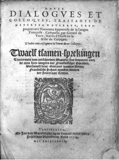 Vivre Gérard (de)● Douze dialogues et colloques, traitants de diverses matieres, tres propres aux Nouveaux Apprentifs de la Langue Françoise● Anvers : Jan van Waesberge● 1574● DOVZE || DIALOGVES ET || COLLOQVES, TRAITANTS DE || DIVERSES MATIERES, TRES- || propres aux Nouueaux Apprentifs de la Langue || Françoise. Composez par Gerard de || Viure, Maitre d’Escole en la || Ville de Coloigne. || L’Indice vous enseignera la Teneur de ces Colloques. || Twaelf tlamen-sprekingen || Tracterende van verchevden Materie/ leer bequame voor || de nieu leer-iougers der Fransoisscher Spraken. || Versamelt deur Geeraert vanden viure / || Fransoische Schoel-meester/ vinneau || der Stadt vau Ceuleu. || [Device] || T’ANTVVERPEN, || By Jan van Waesberghe/ ou de viwaet-merctinden || Schilt van Vlaenderen. Anno 1574. || MET PRIVILEGIE. || USC ● USTC : 78304 . Lindemann, 1994 : p.658, «Gérard de VIVRE».