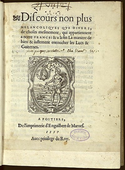 Pélétier Jacques]● Discours non plus melancoliques que divers● Poitiers : Enguilbert de Marnef● (1556) [et] 1557● [fleuron] Discours non plus || MELANCOLIQVES QVE DIVERS, || de choses mesmement qui appartiennent || a notre FRANCE : & a la fin La maniere de || bien & iustement entoucher les Lucs & || Guiternes. || [Device] || A POITIERS, || De l’imprimerie d’Enguilbert de Marnef. || 1557 || Auec priuilege du Roy. USTC ● USTC : 1140 . 1 langue : Français ♢