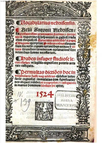 Nebrija Antonio (de)● Vocabularius NebrissensisUSTC● [Lyon] : [Simon Vincent]● 1511● Vocabularius Nebrissensis. Aelij Anthonij Nebrissensis grāmatici Lexicon. i. dictionariū nuprime ex. hispaniēse in gallicū traducū eloquiū : cuß cp̃ plurimis additiōibus a papa & hugone excerptis. Predicatoribus eloquentiam seu verbi copiam optātibus : nec non et ceteris tironibus terminorū explanationem scire volentibus summe per necessarium [...] Lind94 ● USTC : 78016 . Beaulieux, 1904 : p.374 , «Antonius Nebrissensis (Aelius). ». Lindemann, 1985 : p.66 et 80. Lindemann, 1994 : p.601. Shaw, 1997 : Bibliographie C.