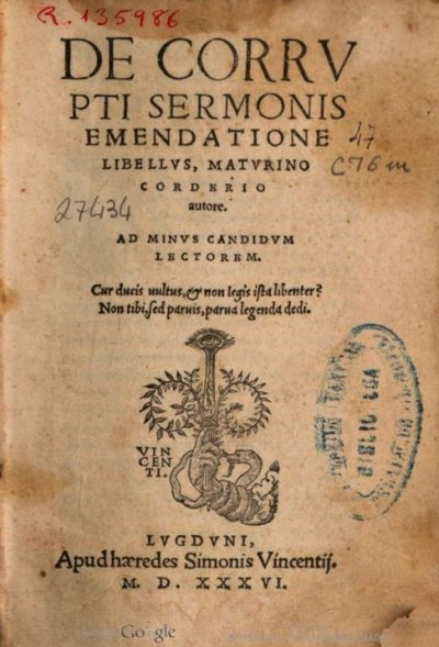 Cordier Mathurin● De corrupti sermonis emendatione libellus● Lyon : Simon Vincent● (1535) et 1536● DE CORRV || PTI SERMONIS || EMENDATIONE || LIBELLVS, MATVRINO || CORDERIO || autore. || AD MINVS CANDIDVM || LECTOREM. || Cur ducis uultus, & non legis ista libenter ? || Non tibi, sed paruis, parua legenda dedi. || [Vignette : VIN || CEN || TI.] || LVGDVNI, || Apud hæredes Simonis Vincentii. || M. D. XXXVI. ● USTC : 78076 . Lindemann, 1994 : p.611, «Mathurin CORDIER».