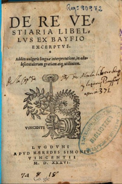 Baïf Lazare (de)● De re vestiaria libellus, addita vulgaris linguae interpretatione● Lyon : (Gaspar Trechsel), (Melchior Trechsel), Simon Vincent● 1536● DE RE VE= || STIARIA LIBEL= || LVS EX BAYFIO || EXCERPTVS. || * || Addita uulgaris linguae interpretatione, in adu= || lescentulorum gratiam atq ; utilitatem. || [Device] || LVGDVNI || APVD HAEREDES SIMONIS || VINCENTII || [-] || M. D. XXXVI. USTC ● USTC : 79711 . 2 langues : Français ♢ Latin ♢