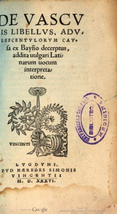 Baïf Lazare (de)● De vasculis libellus● Lyon : (Gaspar Trechsel), (Melchior Trechsel), Simon Vincent● 1536● DE VASCV || LIS LIBELLVS, ADV= || LESCENTVLORVM CAV= || sa ex Bayfio decerptus, || addita uulgari Lati= || narum uocum || interpreta= || tione. || [Device] || LVGDVNI, || APVD HAEREDES SIMONIS || VINCENTII || [-] || M. D. XXXVI. USTC ● USTC : 79712 . Beaulieux, 1904 : p.383 , «Estienne (Charles). ».
