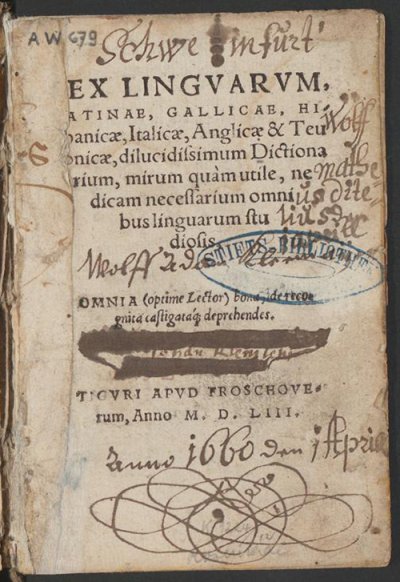 Garon François]BnF● Sex linguarum latinae, gallicae, hispanicae, italicae, anglicae et teutonicae, dilucidissimum dictionarium● Zürich : Christoph Froschauer● 1553● SEX LINGVARVM, || LATINAE, GALLICAE, HI- || spanicae, Italicae, Anglicae & Teutonicae, dilucidissimum Dictiona || rium, mirum quàm utile, ne || dicam necessarium omni || bus linguarum stu || diosis. || OMNIA (optime Lector) bona, fide reco= || gnita castigata’q ; deprehendes. || TIGVRI APVD FROSCHOVE= || rum, Anno M. D. LIII. USTC ● USTC : 76500 , 693826 . Beaulieux, 1904 : p.396 . Lindemann, 1994 : p.653. Niederehe, 1995 : n°354.