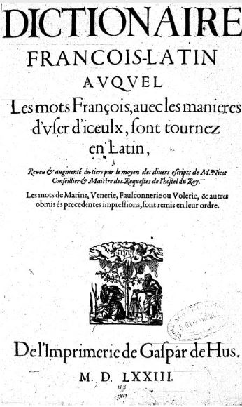 Estienne Robert] :Nicot Jean● Dictionaire francois-latin● [Genève] : Gaspard de Hus● 1573● USTC : 76044 . Wooldridge, 1977 : p.61; 2e éd. 1997 et 2010 : 1.7. Lindemann, 1994 : p.593, «Jean NICOT».