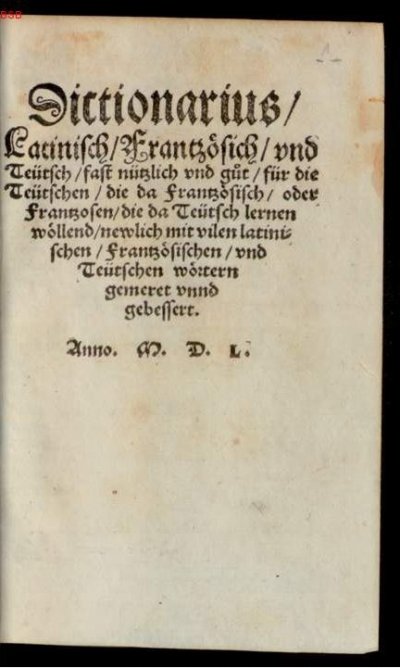 ● Strasbourg : Wolfgang Köpfel● 1550● Dictionarius/ || Latinisch/ Frantzoͤsisch/ vnd || Teütsch/ fast nützlich vnd gůt/ für die || Teütschen/ die da Frantzoͤsisch/ oder || Frantzosen/ die da Teütsch lernen || woͤllend/ newlich mit vilen latini= || schen/ Frantzoͤsischen/ vnd || Teütschen woͤrtern || gemeret vnnd || gebessert.|| Anno. M. D. L. ● USTC : 636332 . Lindemann, 1994 : p.621.