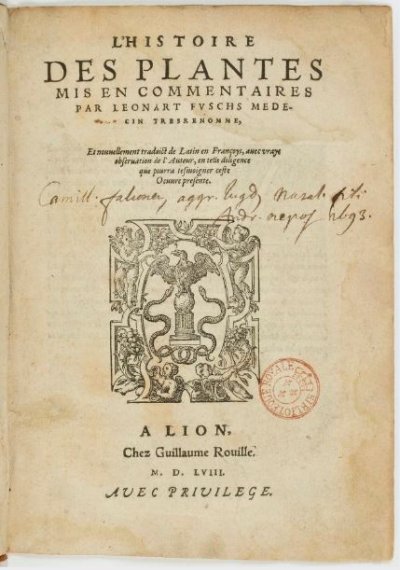 Fuchs Leonhart● L’histoire des plantes● Lyon : (Veuve Balthazar Arnoullet), Guillaume Rouillé● 1558● L’HISTOIRE || DES PLANTES || MIS EN COMMENTAIRES || PAR LEONART FVSCHS MEDE- || CIN TRESRENOMME, || Et nouuellement traduict de Latin en Françoys, auec vraye || obseruation de l’Auteur, en telle diligence || que pourra tesmoigner ceste || Oeuure presente. || [Device] || A LION, || Chez Guillaume Rouille. || M.D.LVIII. || AVEC PRIVILEGE. USTC ● USTC : 42045 . 2 langues : Français ♢ Latin ♢