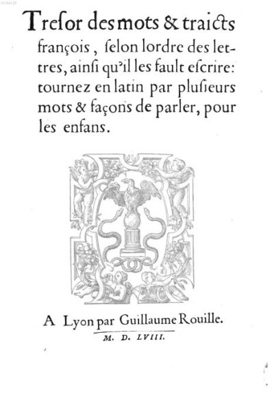 Estienne Robert]● Tresor des mots et traicts francois selon lordre des lettres, ainsi qu’il les fault escrire : tournez en latin par plusieurs mots & façons de parler, pour les enfans● Lyon : Guillaume Rouillé● 1558● Tresor des mots & traicts || françois, selon l’ordre des let- || tres, ainsi qu’il les fault escrire : || tournez en latin par plusieurs || mots & façons de parler, pour || les enfans. || [Device] || A Lyon par Guillaume Rouille. || [-] || M. D. LVIII. || USTC ● USTC : 37125 . Lindemann, 1994 : p.570, «[Robert ESTIENNE]».