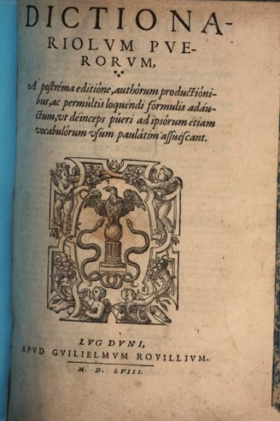Estienne Robert]● Dictionariolum puerorum. A postréma editiône, authôrum productiónibus, ac permúltis loqúendi fórmulis adáuctum, ut déinceps púeri ad ipsôrum étiam vocabulôrum usum paulâtim assuéscant● Lyon : Guillaume Rouillé● 1558● DICTIONA- || RIOLVM PVE- || RORVM, || [three fleurons] || A postréma editiône, authôrum productióni- || bus, ac permúltis loqúendi fórmulis adáu- || ctum, vt déinceps púeri ad ipsôrum étiam || vocabulôrum vsum paulâtim assuéscant. || [pritner’s device] || LVGDVNI, || APVD GVILIELMVM ROVILLIVM. || [-] || M. D. LVIII. || USTC ● USTC : 63587 . Lindemann, 1994 : p.570, «[Robert ESTIENNE]».