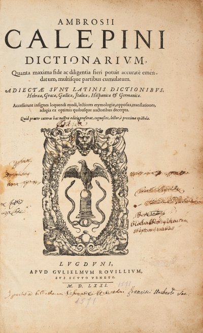 Calepino Ambrogio● Dictionarium [...] adjectae sunt Latinis dictionibus Hebraeae, Graecae, Gallicae, Italicae, Hispanicae et Germanicae● Lyon : Guillaume Rouillé● 1570● Ambrosii || Calepini || Dictionarivm, || Quanta maxima fide ac diligentia fieri potuit accuratè emen-lldatum, multisque partibus cumulatum. || Adiectae svnt latinis dictionibvs, || Hebraeae, Graecae, Gallicae, Italicae, Hispanicae & Germanicae. || Accesserunt insignes loquendi modi, lectiores etymologiae, opposita, translationes, || adagia ex optimis quibusque auctoribus decerpta. || Quid praeter caeteras haec nostra editio proferat, cognosces, lector, è proxima epistola. || < Marca > || Lvgdvni, || apvd Gvlielmvm Rovillivm, || svs scvto veneto. || — || M. D. LXX. Niede95 ● Musée Virtuel des Dictionnaires (MVD).