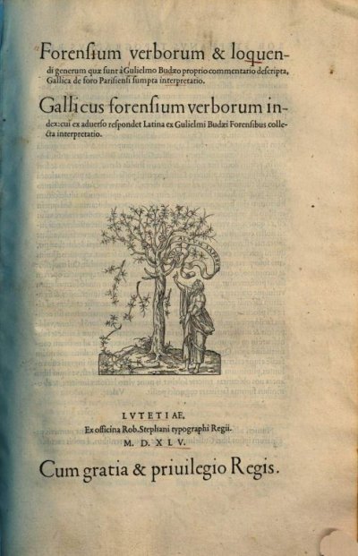 Budé Guillaume : [Luc Jean (de)]● Forensium verborum et loquendi generum quae sunt a Gulielmo Budaeo proprio commentario descripta, Gallica de foro Parisiensi sumpta interpretatio● Paris : Robert I Estienne● 1545● Forensium verborum & loquen- || di generum quae sunt à Gulielmo Budaeo proprio proprio commentario descripta, || Gallica de foro Parisiensi sumpta interpretatio. || Gallicus forensium verborum in- || dex : cui ex aduerso respondet Latina ex Gulielmi Budaei Forensibus colle- || cta interpretatio. || [device : tree and man] || LVTETIAE, || Ex officina Rob. Stephani typographi Regii. || M. D. XLV. || Cum gratia & priuilegio Regis. USTC ● BP16 : BP16_111972 . USTC : 67919 , 149387 . Beaulieux, 1904 : p.376 , «Budé (Guillaume). ». Lindemann, 1994 : p.589, «[Jo. LUCIUS]».