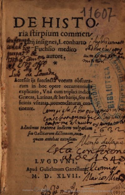 Fuchs Leonhart● De historia stirpium commentarii insignes● Lyon : [Balthazar Arnoullet], Guillaume Gazeau● 1547● DE HISTO- || ria stirpium commen- || tarii insignes, Leonharto || Fuchsio medico || autore. || * || Accessit ijs succincta vocum obscura- || rum in hoc occurrentium || explicatio, Vnà cum triplici indice, || Graecas, Latinas, & herbarijs, seu of- || ficinis vsitatas nomenclaturas con- || tinente. || Adiecimus praeterea indicem vulgarium || seu Gallicarum dictionum, nun- || quam antehac excusum. || LVGDVNI, || Apud Gulielmum Gazellum. || M. D. XLVII. USTC ● USTC : 79597 . 2 langues : Français ♢ Latin ♢