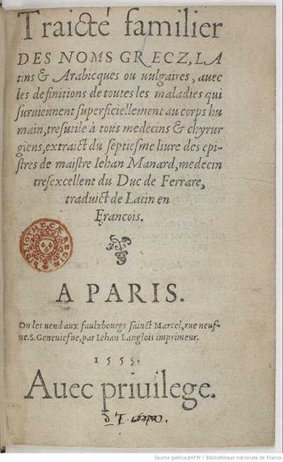 Manardi Giovanni● Traicté familier des noms grecz, latins et arabicques ou vulgaires● Paris : Jean Langlois● 1552● Traicté familier || DES NOMS GRECZ, LA || tins & Arabicques ou uulgaires, auec || les definitions de toutes les maladies qui || suruiennent superficiellement au corps hu || main, tresutile à tous medecins & chyrur || giens, extraict du septiesme liure des epi- || stres de maistre Iehan Manard, medecin || tresexcellent du Duc de Ferrare, || traduict de Latin en || Francois. || [fleuron] || A PARIS. || On les uend aux faulxbourgs sainct Marcel, rue neuf- || ue. S. Geneuiefue, par Iehan Langlois imprimeur. || 1552. || Auec priuilege. USTC ● USTC : 29692 . 4 langues : Arabe ♢ Français ♢ Grec ♢ Latin ♢