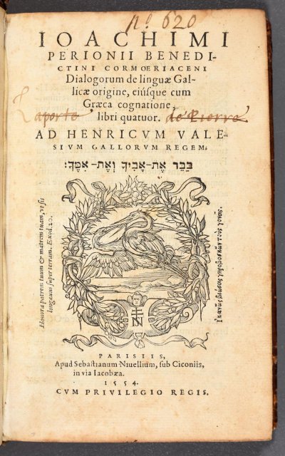 Périon Joachim● Dialogorum de linguae gallicae origine, ejusque cum graeca cognatione libri quatuor● Paris : Sébastien Nivelle● 1554● IOACHIMI || PERIONII BENEDI- || CTINI CORMOERIACENI || Dialogorum eiúsque cum || Graeca cognatione, || libri quatuor. || AD HENRICVM VALE- || SIVM GALLORVM REGEM. || [Device] || PARISIIS, || Apud Sebastianum Niuellium, sub Ciconiis, || in via Iacobaea. || 1554. || CVM PRIVILEGIO REGIS. USTC ● USTC : 78175 , 154234 . Musée Virtuel des Dictionnaires (MVD).